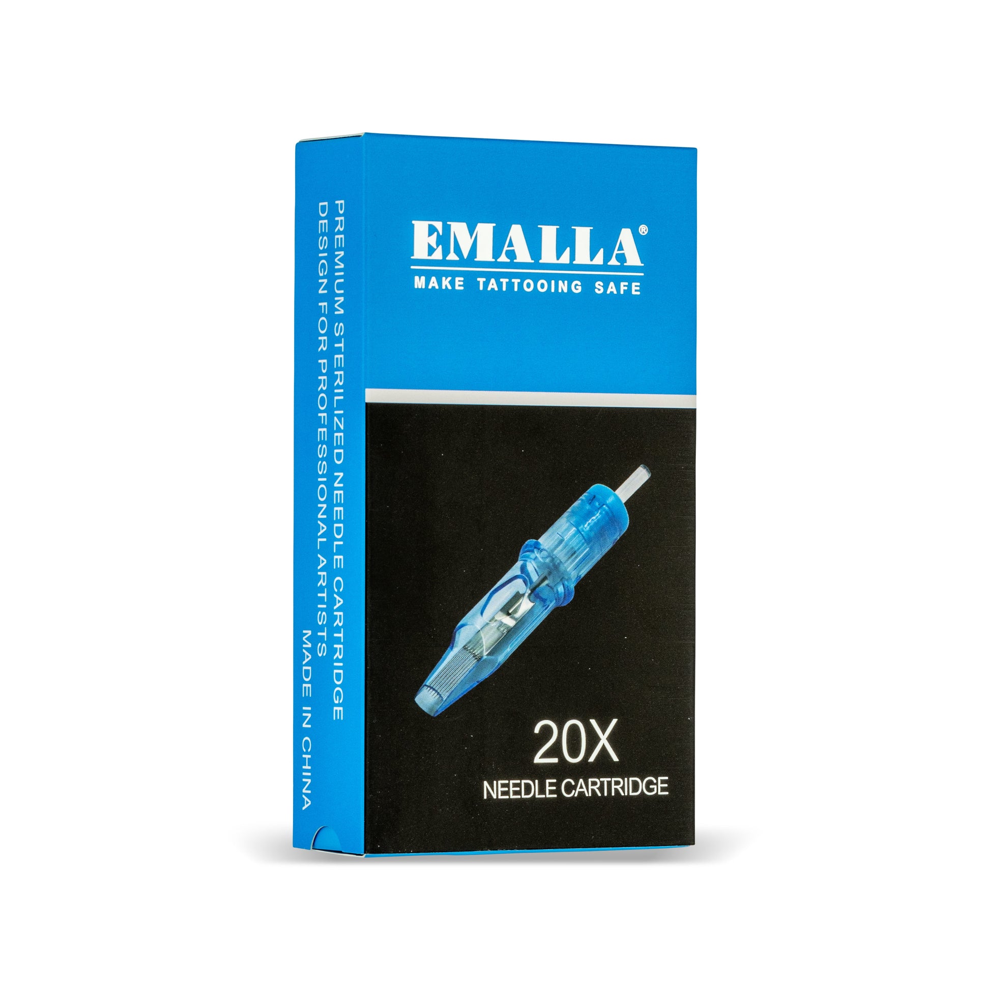 This box of 20 Emalla Curved Magnum Tattoo Cartridge Needles is designed for liner and shader tattooing. They feature an innovative titanium alloy construction for superior strength and durability. The curved design ensures optimal ink flow.