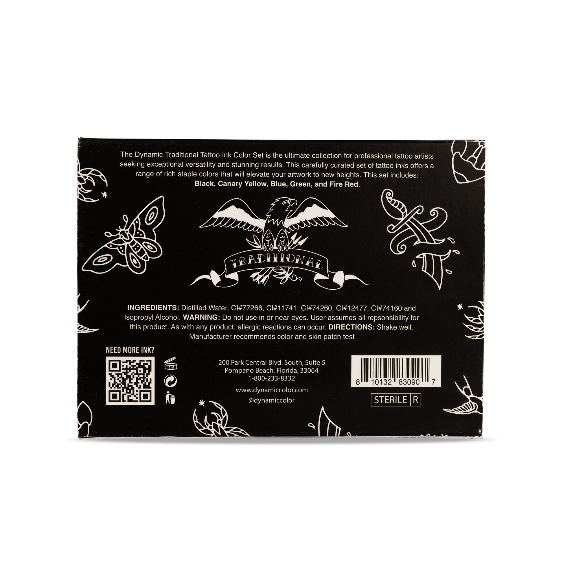 Dieses 1oz Dynamic-Farbset enthält eine solide Auswahl traditioneller Tattoo-Tintenfarben. Es enthält jeweils eine 1oz-Flasche der Farben Schwarz, Kanariengelb, Blau, Grün und Feuerrot.