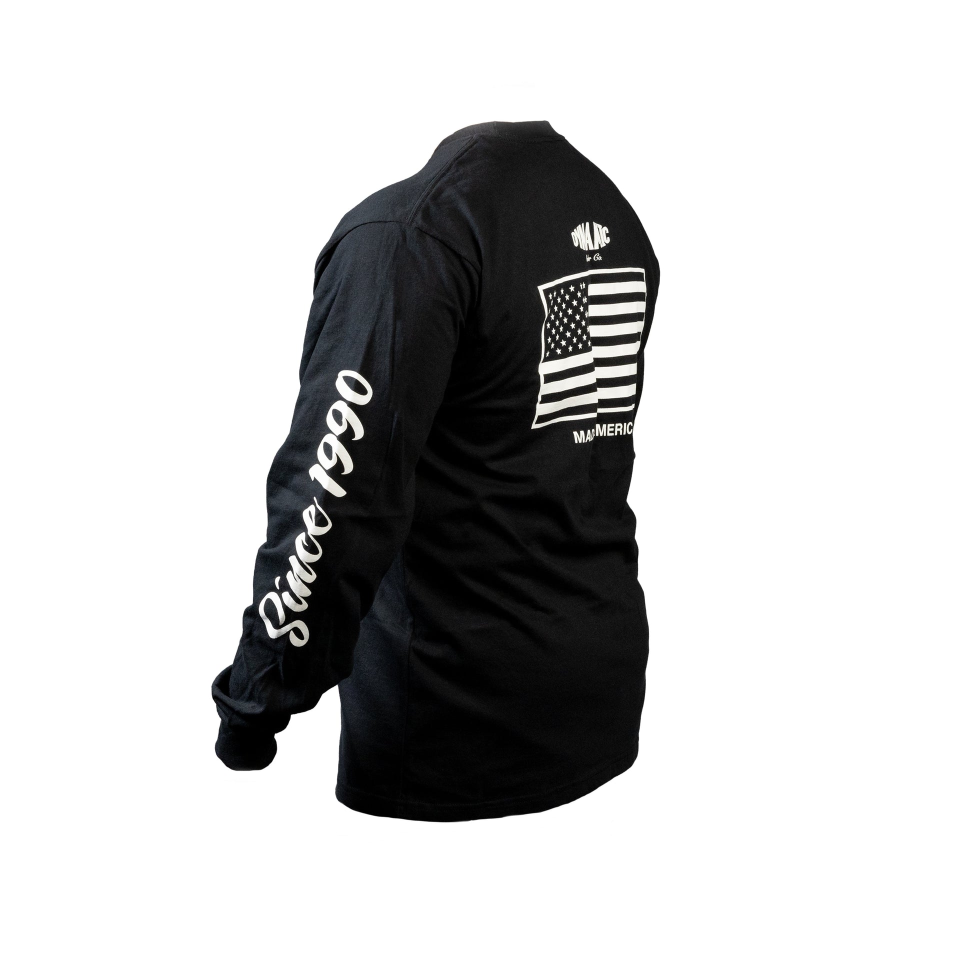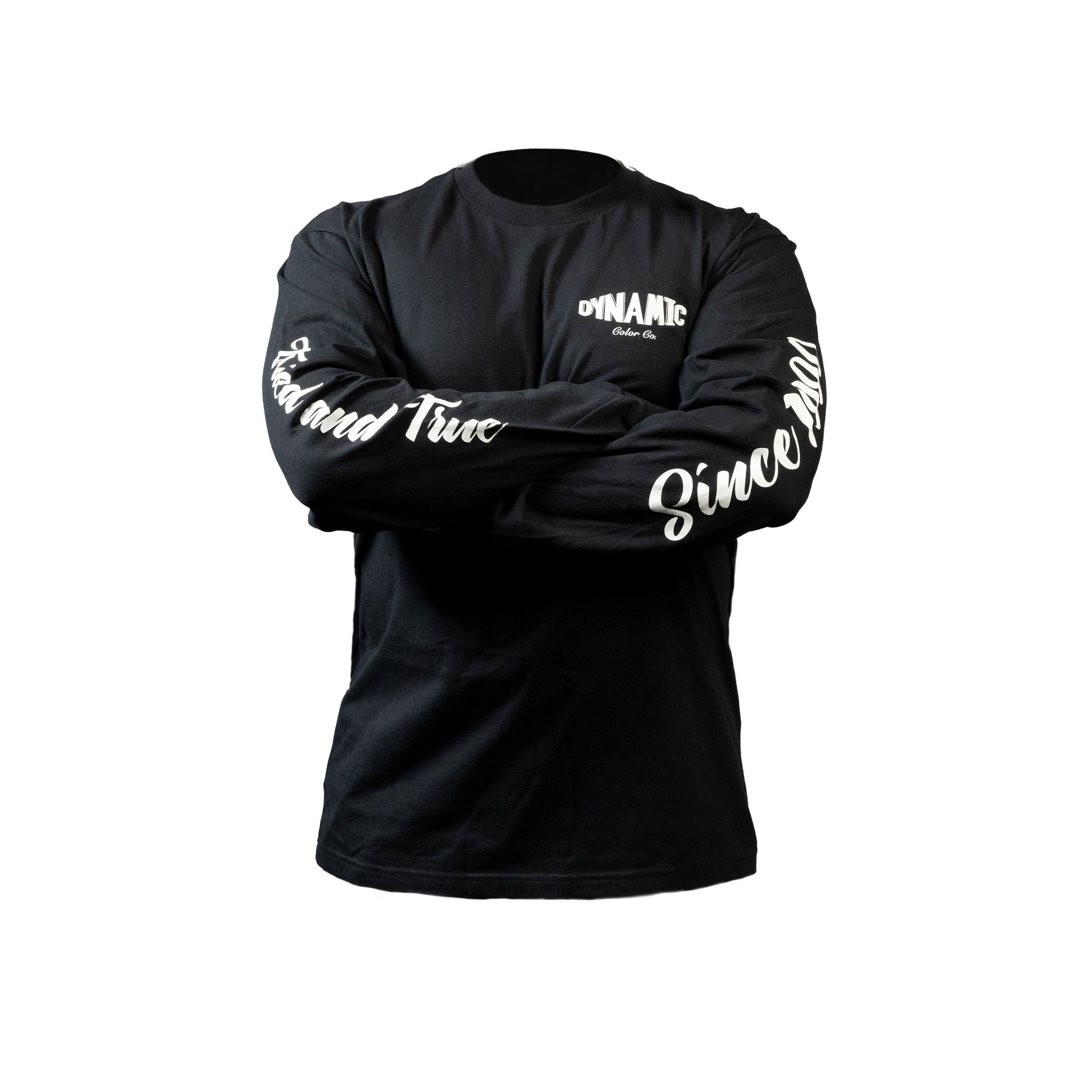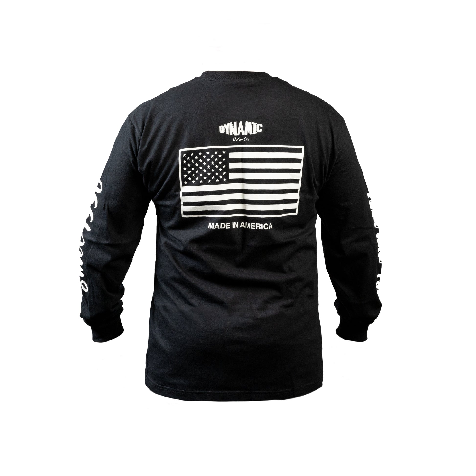 Represent Dynamic Color with our Tried and True Made in America Since 1990 Shirt. This long sleeve shirt sports a full back American flag, Tried and True down one arm, Since 1990 down the other and our classic Dynamic Logo on the front.