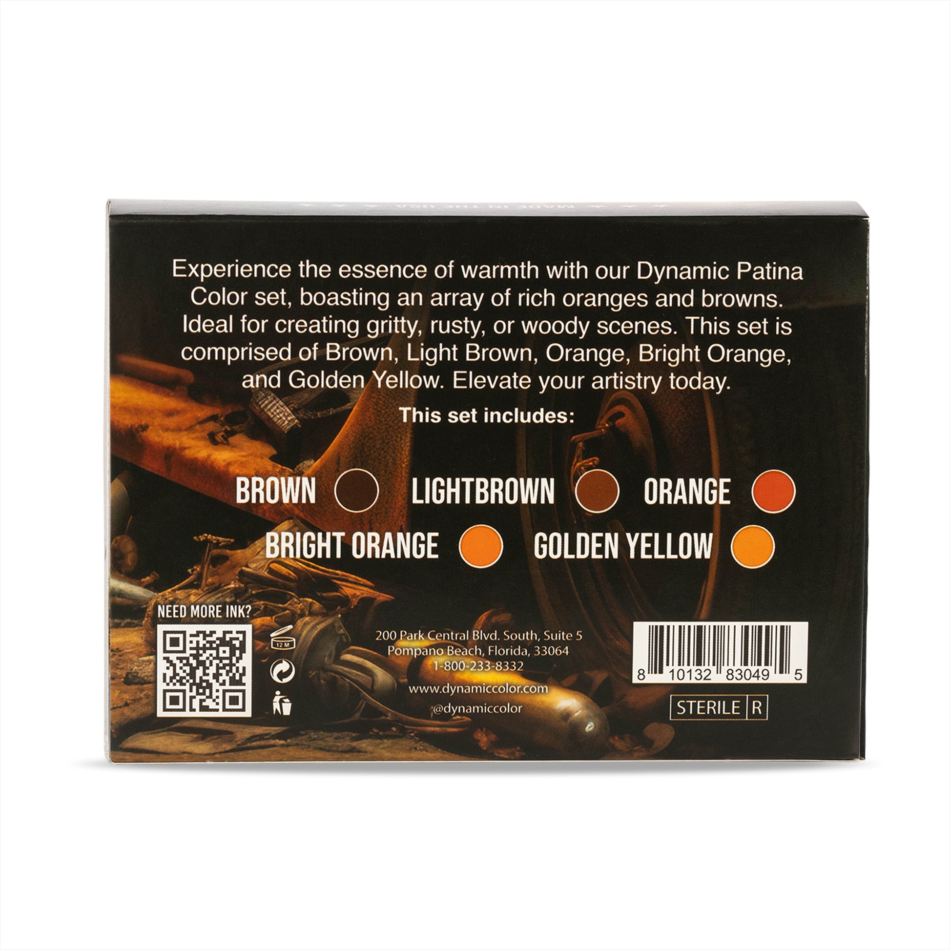 This 1oz Dynamic color set includes a wide range of warm tones with oranges and browns, perfect for gritty, rusty, and woody scenes. This set includes a 1oz bottle of each: Brown, Light Brown, Orange, Bright Orange, and Golden Yellow