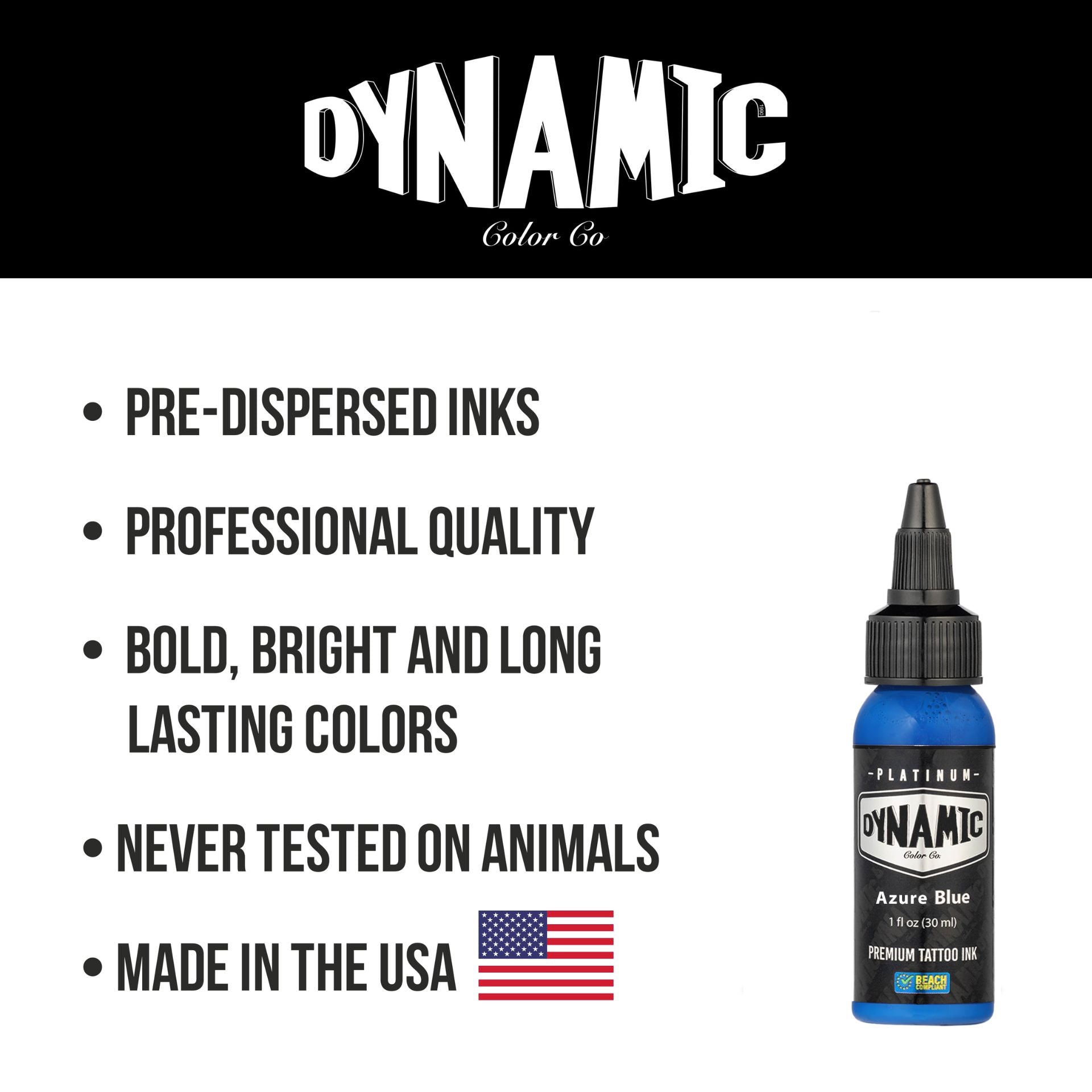 Vegan and Never Tested on Animals: Dynamic Color products contain zero animal products and are never tested on any furry friends. Our tattoo inks are safe on the skin, better for the environment, and ultimately preferred for your overall health.